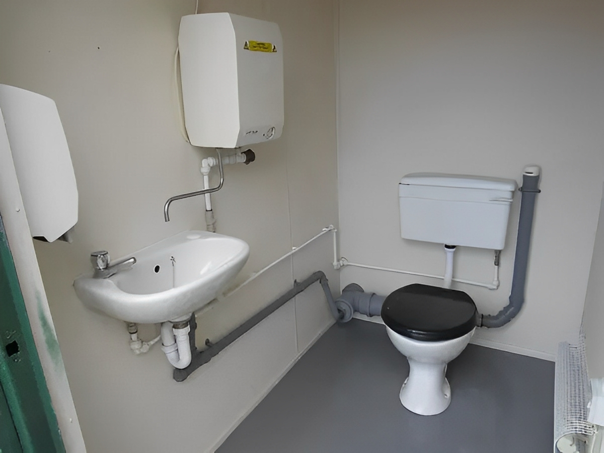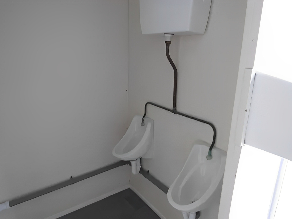 Die 2+1-Konfiguration bietet zwei Herrentoiletten, zwei Urinale, zwei Waschbecken mit Warmwasserbereiter auf der Herrenseite sowie eine separate Damentoilette mit eigenem Waschbecken und Warmwasserbereiter. Alle Räume sind mit elektrischer Beleuchtung, Heizung und Abluftventilatoren für Komfort und Belüftung ausgestattet. Die Anlage steht stabil auf Eckpfosten, ohne dass Stützfüße benötigt werden, und ist dank ihrer robusten Stahlkonstruktion vandalismus- und diebstahlsicher.